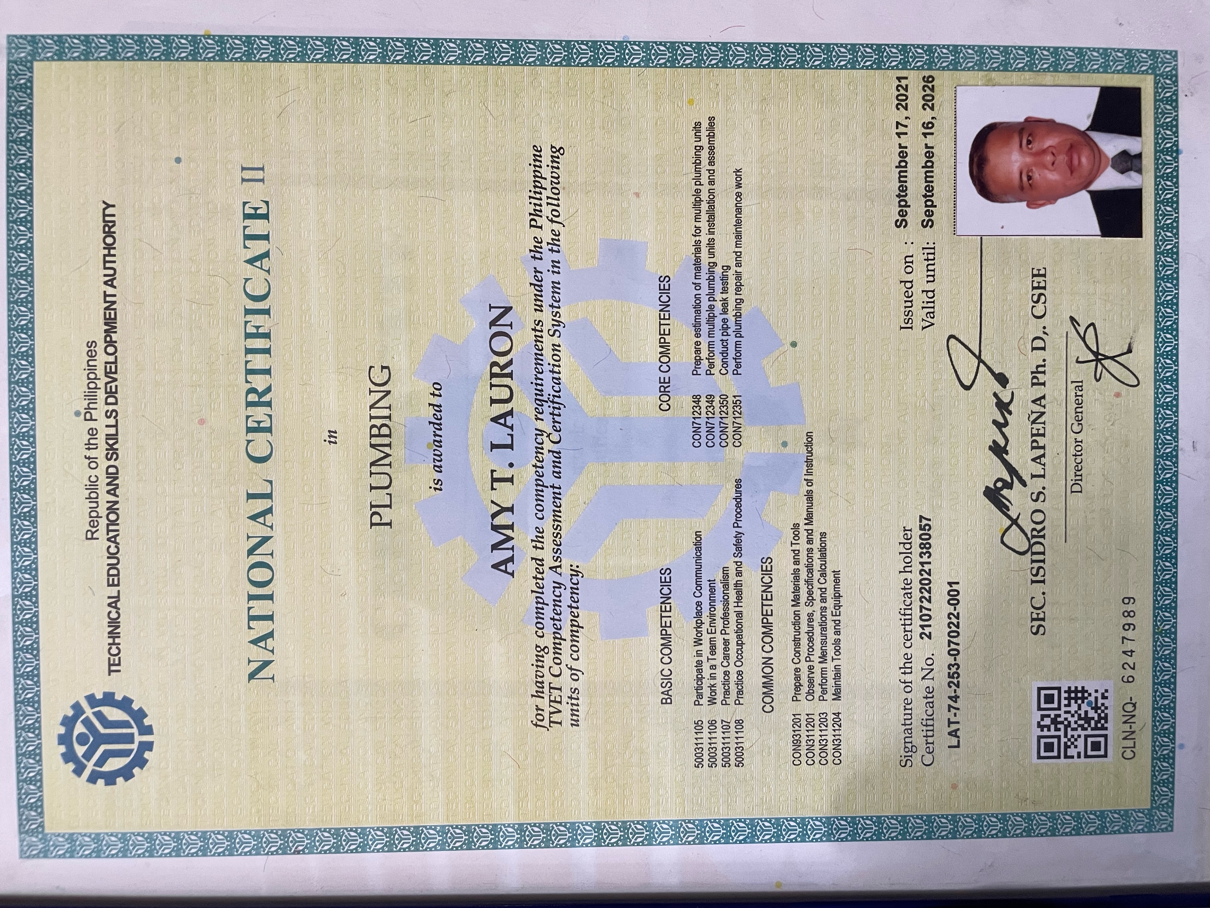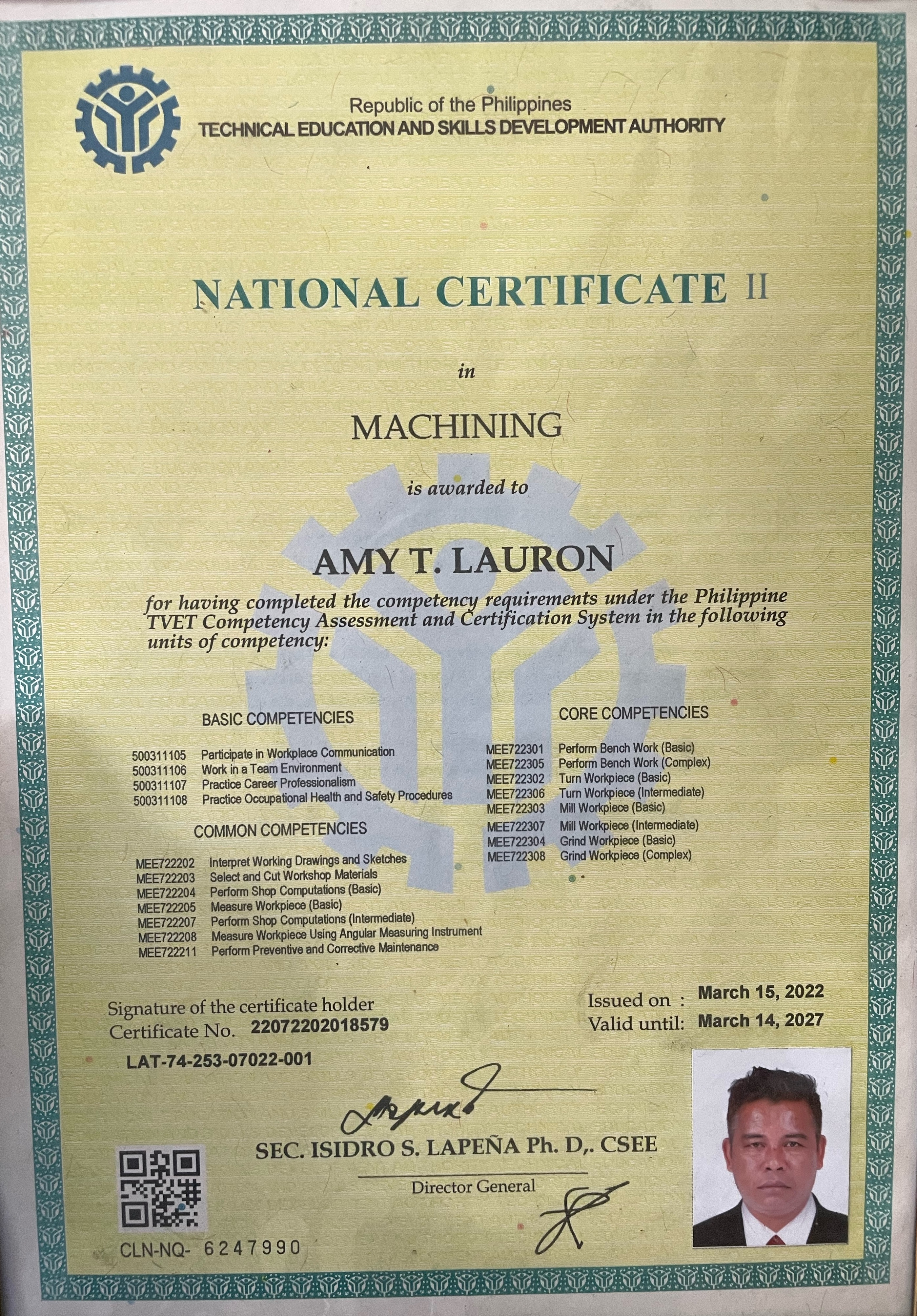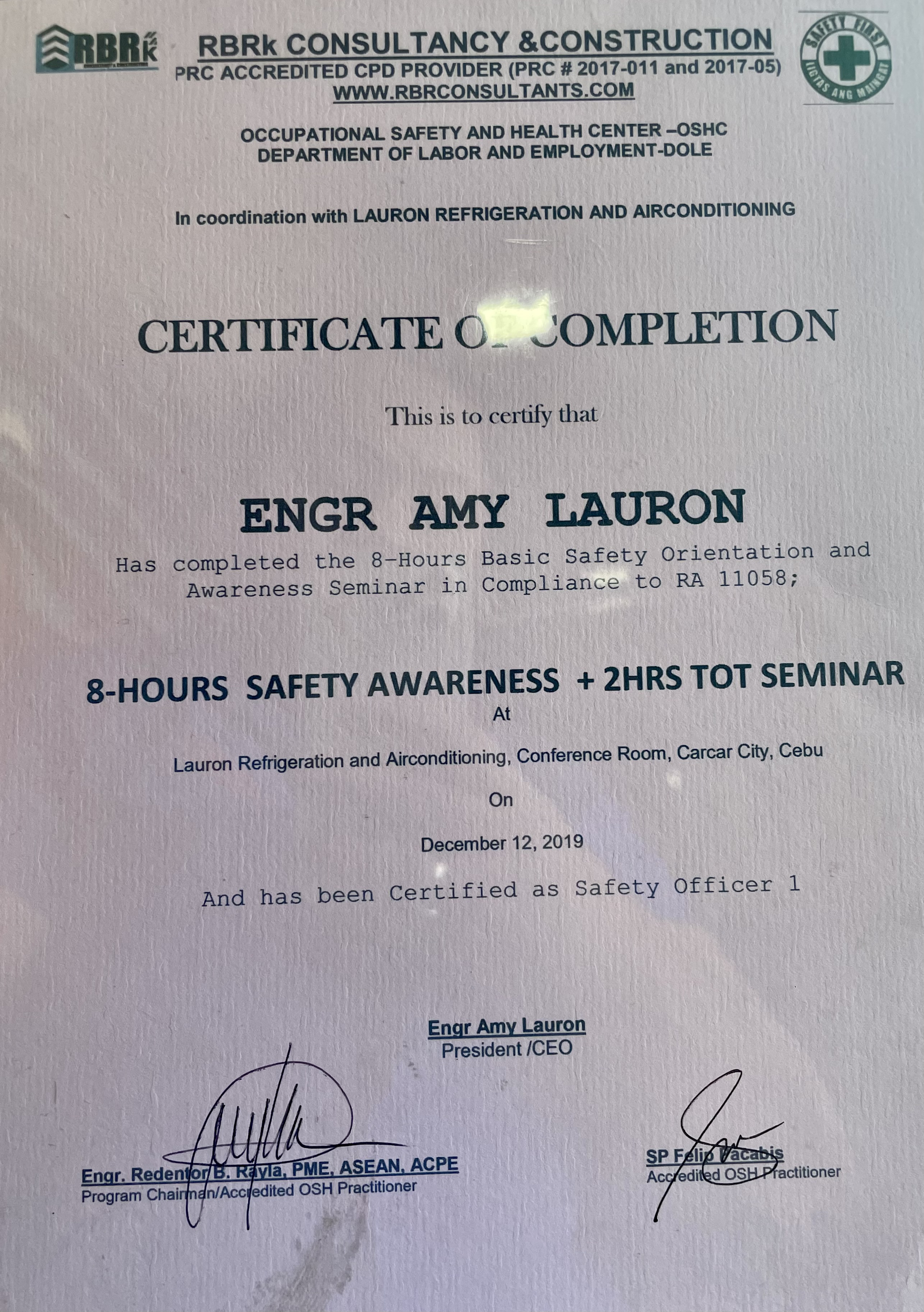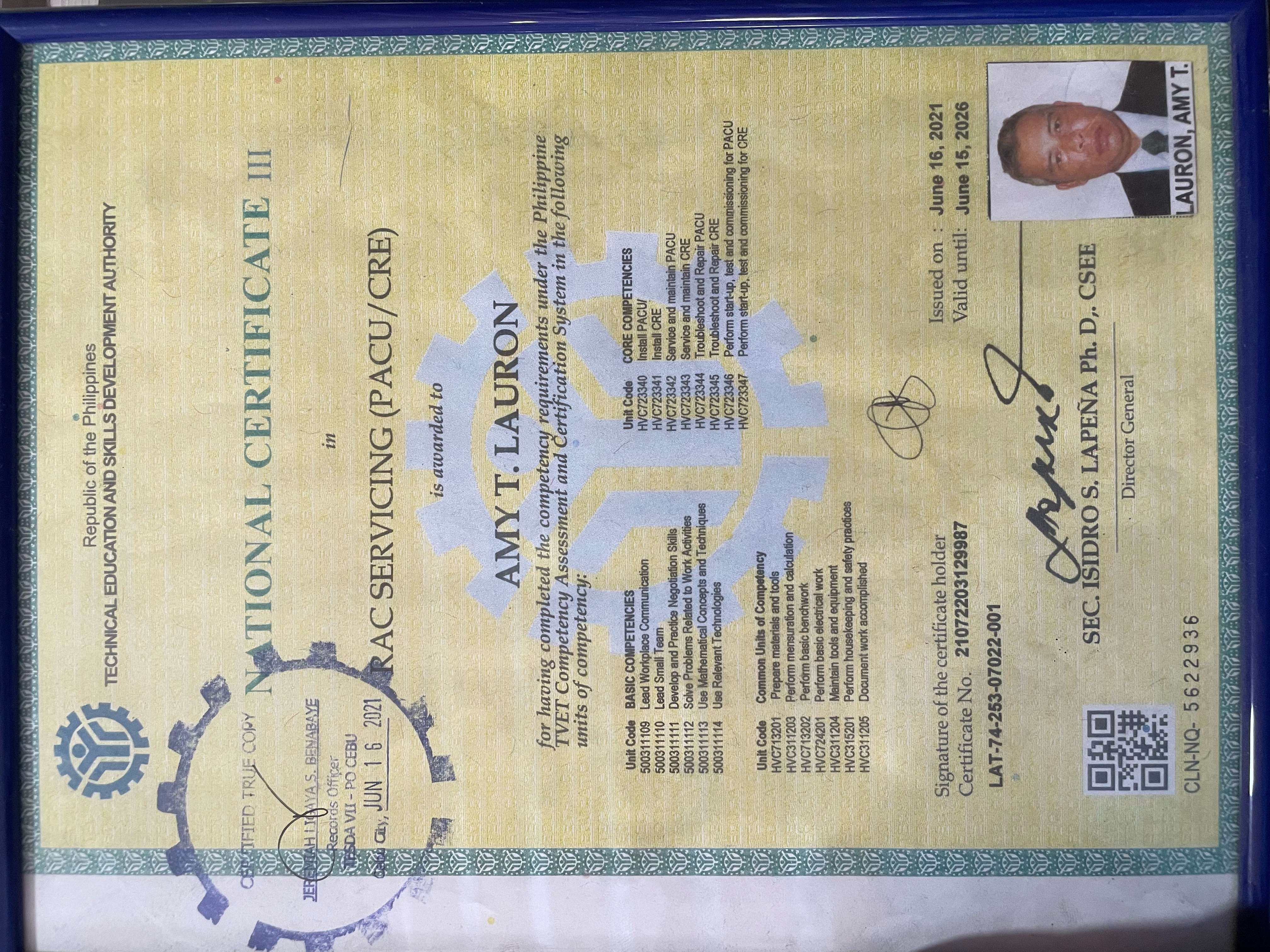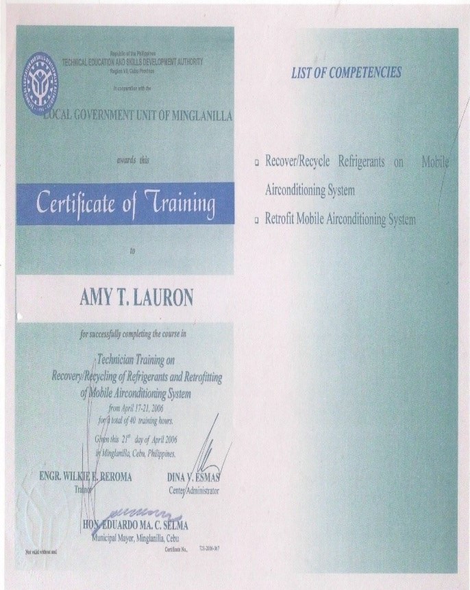 who was also a Refrigeration and Air-conditioning TESDA instructor together with his wife Charito L. Lauron started